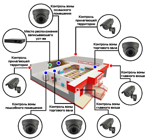 В зависимости от площади магазина, количества наблюдаемых/охраняемых объектов, как правило, требуется от 5 до 50 точек контроля (видео-камер), включая камеры для наружного и внутреннего наблюдения.